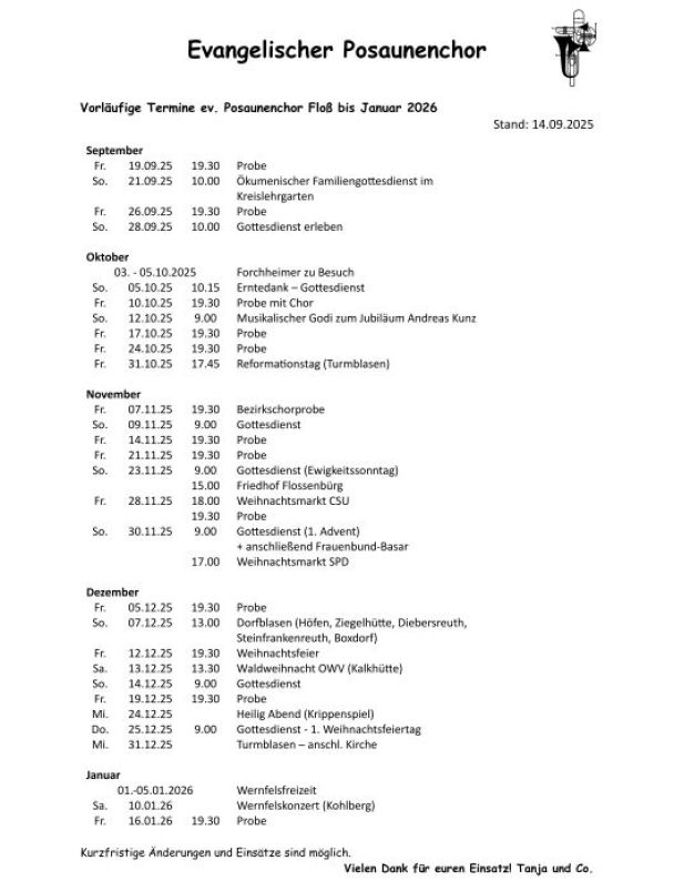Bereits 10 Jahre sind vergangen, seit der Evangelische Posaunenchor Floß sein 50-jähriges Bestehen mit einem Festabend in der Mehrzweckhalle gefeiert hat. In diesem Jahr wird der Chor somit 60 Jahre, was gefeiert werden will.
