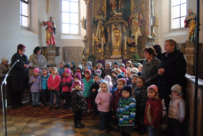 Am 5. Mai trafen sich die Kinder der evangelischen Kindertagesstätte "Unterm Regenbogen" mit ihren Erzieherinnen, Kinderpflegerinnen und Eltern, um einen mit Mäusen, Enten und Fröschen